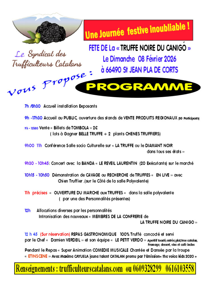 Programme de la journée : animations, tombola, concert, séance de cavage, conférence animée documentaires sur la vie de la truffe, ouverture du marché à la truffe à 11h, allocutions, intronisation de « la truffe noire du Canigó », etc…