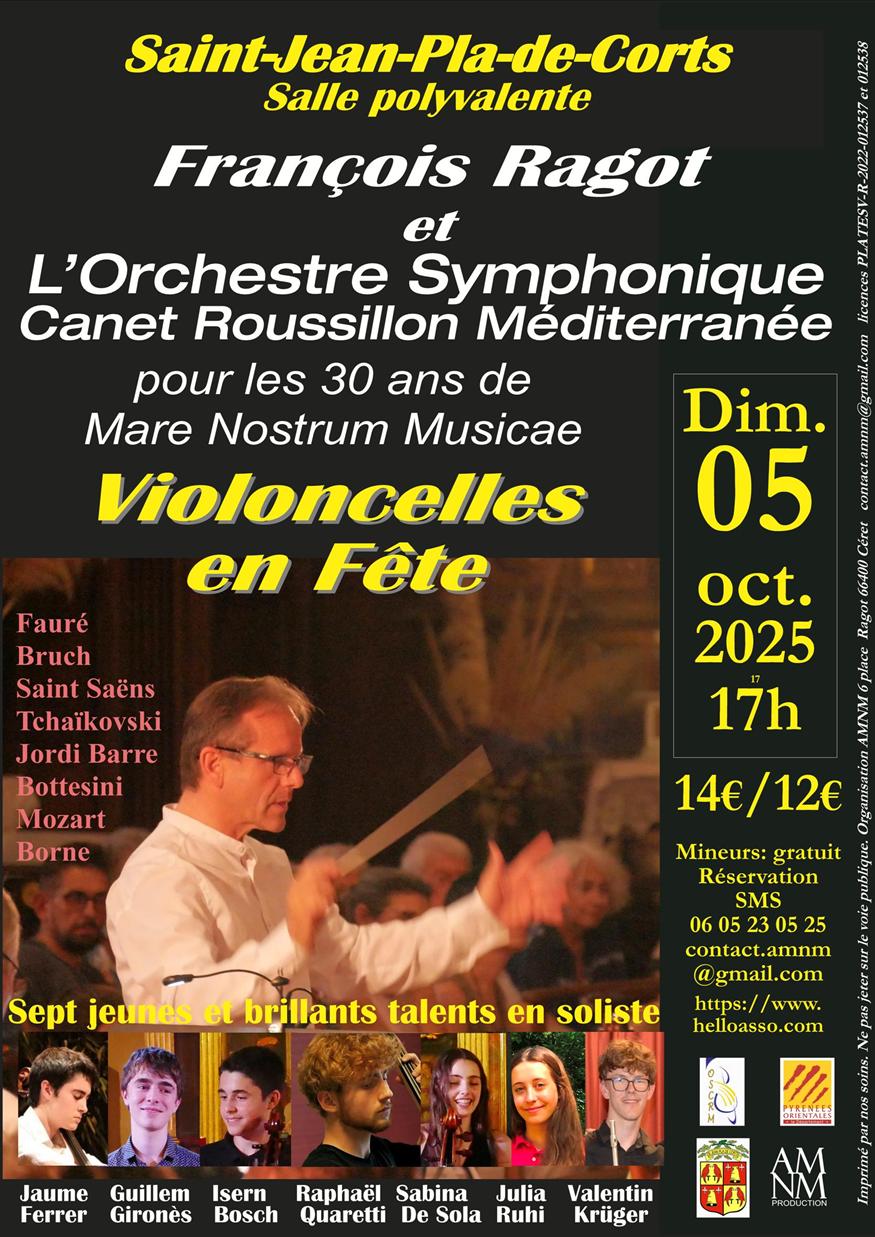 « Violoncelles en fête » est organisé conjointement par l’Orchestre Symphonique Canet en Roussillon Méditerranée et l’association AMNM pour les trente ans du collectif « Mare Nostrum Musicae ». L’occasion d’honorer l’action de François Ragot en rassemblant ceux qui ont compté pour lui dans sa vie de violoncelliste soliste et chambriste, de chef d’orchestre, de meneur de projets et de pédagogue dévoué.